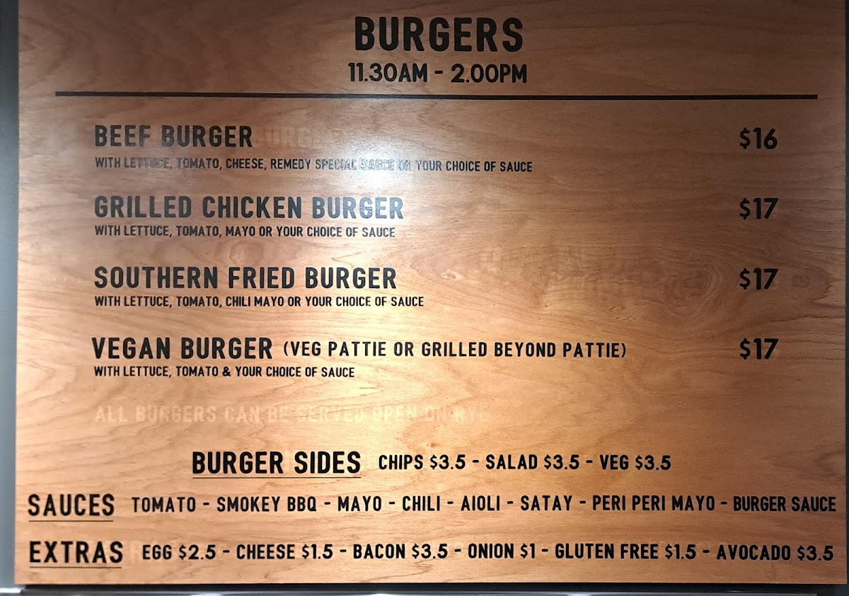 - Burgers: Indulge in the Grilled Chicken Burger, Southern Fried Burger, or a satisfying Vegan Burger, each priced at A$17.00.